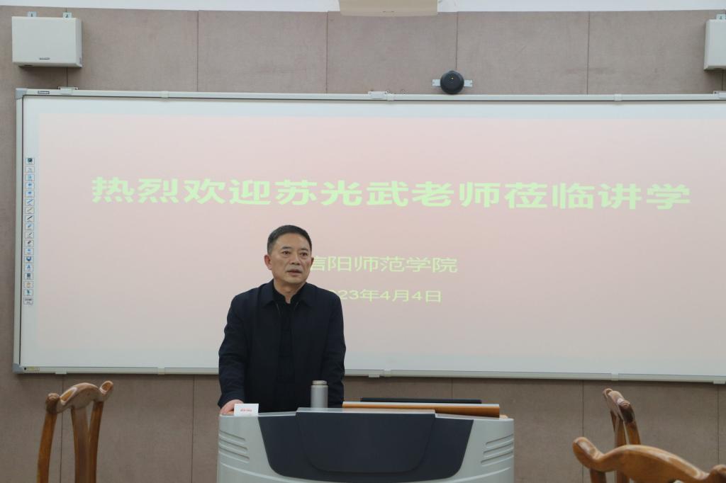 为进一步传承和弘扬中华优秀传统文化,培养大学生对书法的兴趣,修身养性、陶冶情操,不断提升美学修养。4月4日下午,应学校学生工作部(处)与教师教育学院的邀请,中国书协会员、信阳市书协副主席苏光武老师莅临教师教育学院,开展了题为《书法审美与修身养性》的讲座,学校大学生心理健康教育中心主任、学生工作处副处长李贵杰,学院党委副书记王艳蕊、副院长李文田以及部分学生参加讲座交流。