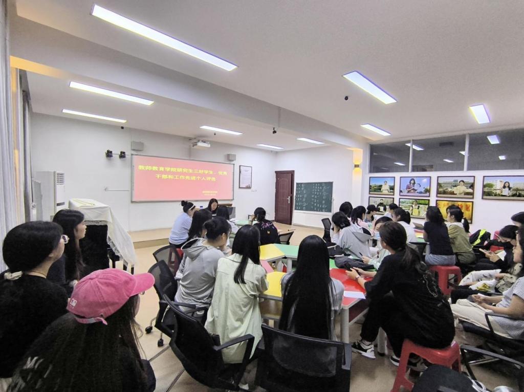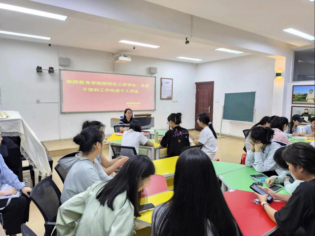为表彰先进、树立典型,激励研究生在各方面积极进取。教师教育学院于6月3日下午在教七楼402举行了研究生三好学生、优秀干部和先进个人评选活动。本次活动由学院研究生秘书兼辅导员常燕燕老师主持。2023级、2024级全体研究生参加。