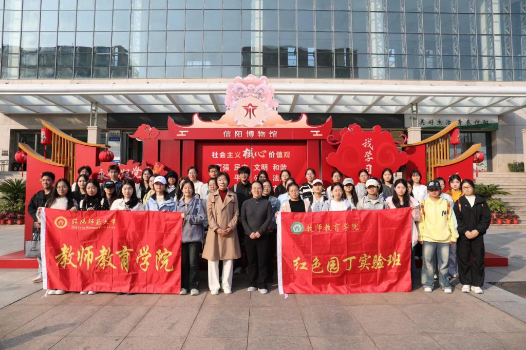 为全面提升师范生的综合素质,深化红色文化教育与实践育人融合,11月16日,在学院党委副书记王淑贤、班主任谭阿明的带领下,2024级红色园丁实验班、小学教育专业研究生以及“48”读书计划小组学生,共同前往文新茶村与信阳博物馆,开展以“传承红色基因 品味茶香文化”为主题的红色研学活动。