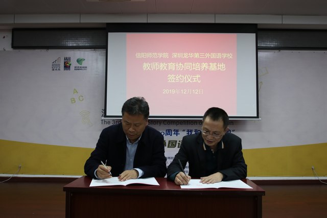 12月12日,信阳师范学院教师教育学院与深圳市龙华第三外国语学校共建教师教育协同培养基地及研究生培养工作站签约仪式在深圳市龙华第三外国语学校举行。教师教育学院副院长付永昌,深圳市龙华第三外国语学校校长聂细刚等出席仪式。仪式由聂细刚主持。