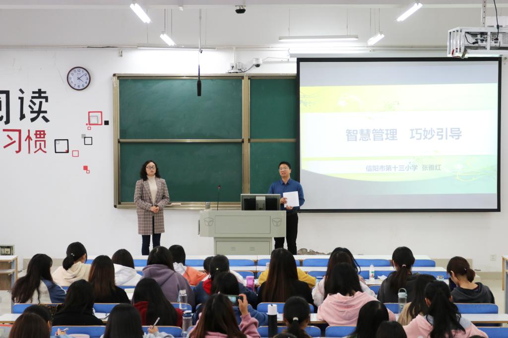 11月14日下午14:00-18:00,2018级小学教育专业本科1班、2班全体学生,在社科楼121教室开展教育见习实践活动。由于本学期受疫情的影响,特邀请信阳市第十三小学名班主任工作室主持人张雅红和语文教师陈文俊来校指导2018级小学教育专业见习实践活动。教育见习实践活动由张祥耀老师组织。