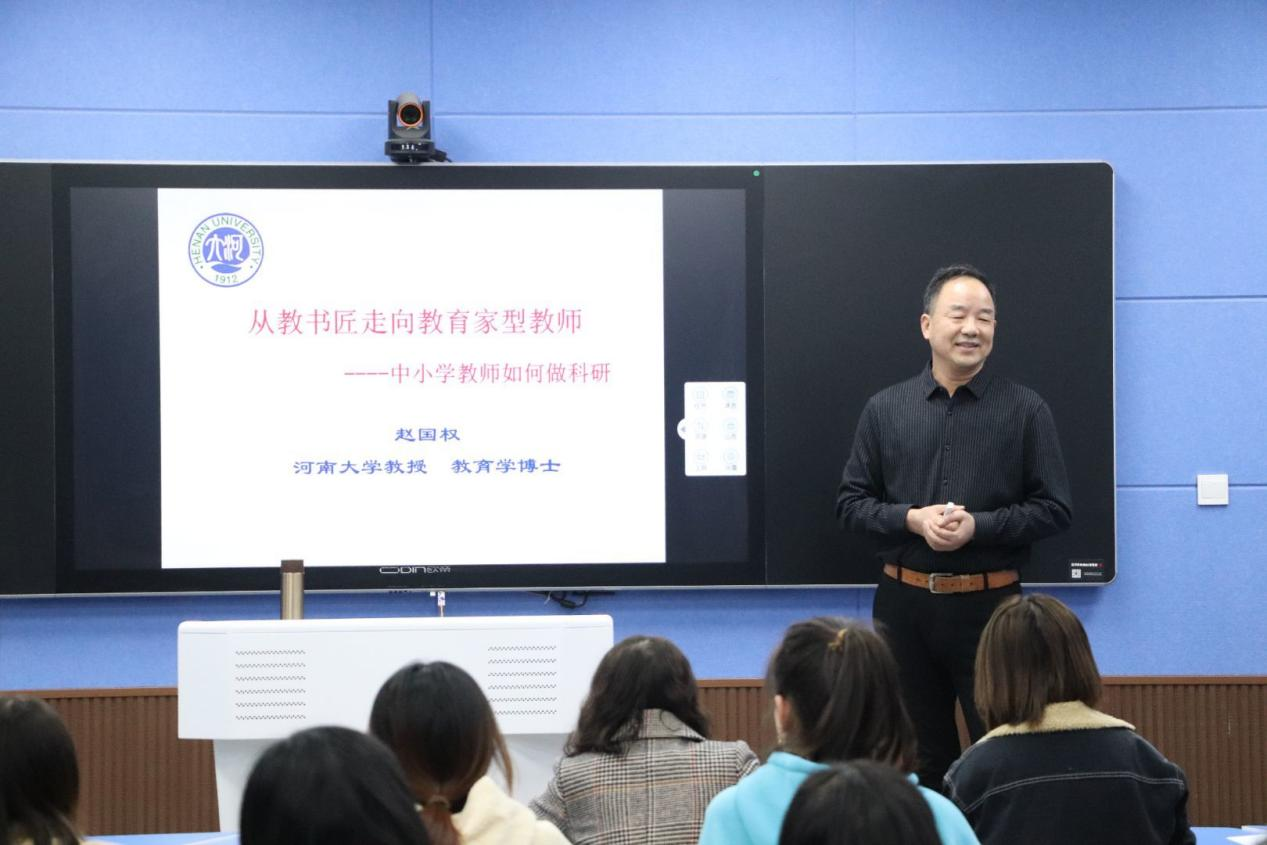 10月19日下午,应教师教育学院邀请,河南大学赵国权教授在人文楼707教室为2019级红色园丁实验班学生、小学教育专业硕士研究生和部分教师作了“从教书匠走向教育家型教师——中小学教师如何做科研”的精彩报告。报告会由教师教育学院院长付永昌主持。