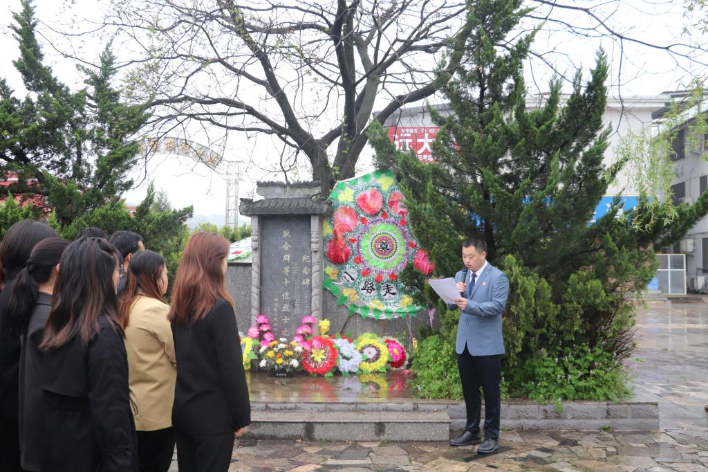 上午9:00,一行人来到“中原突围”战斗旧址参与革命先烈缅怀仪式,刘莅原主持。在庄严肃穆的国歌中,仪式正式开始。党员和团员代表向革命烈士敬献花篮、默哀,传达着内心的缅怀和哀思。雷玲部长带领党员重温了入党誓词,一句句入党誓词在碑前回响,提醒每一位党员“不忘初心、牢记使命”。接着,教师代表刘莅原为全体人员分享微团课,他从“中原突围”战役发生的历史背景切入,讲述了中原解放军艰苦奋战的过程和为心中理想英勇牺牲的大无畏精神。学生代表邵银萍在演讲中谈到,作为一名党员,要加强对四史的学习,进一步了解党的发展历程,继承和发扬先烈们的革命精神。最后,朱书记对在场学生提出三点要求。一是不忘初心,牢记使命,从革命先辈身上汲取伟大爱国奋斗精神,坚定理想信念;二是努力学习,增长本领,把握好青春时光,努力提升自身综合素质,成长为能堪大用的栋梁之才;三是注重实践,知行合一,注重理论实践相结合,把革命烈士不怕困难、不畏艰险的精神转化为锐意进取、扎实工作的实际行动。