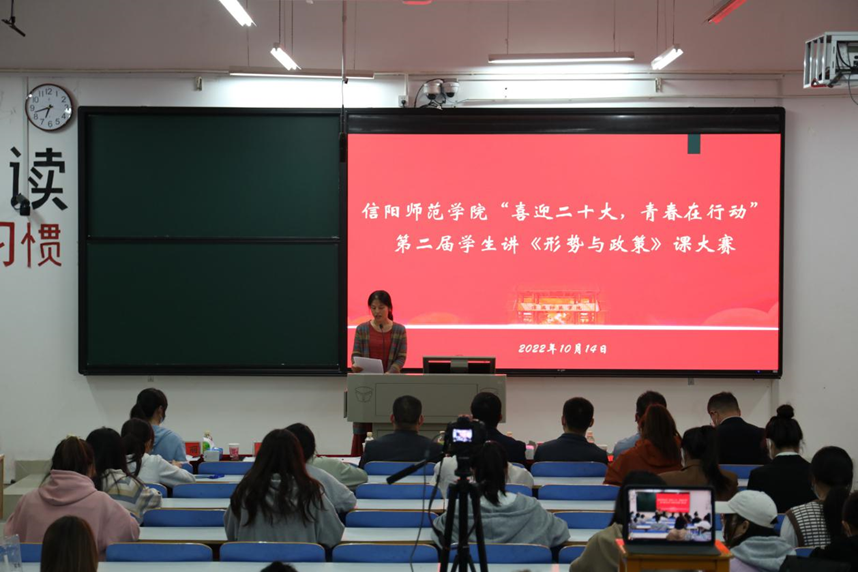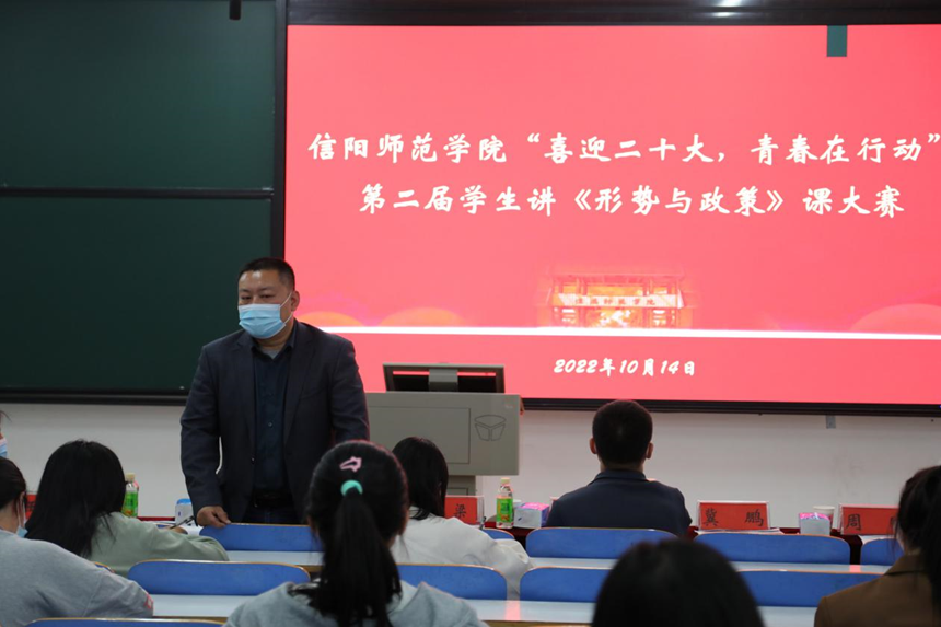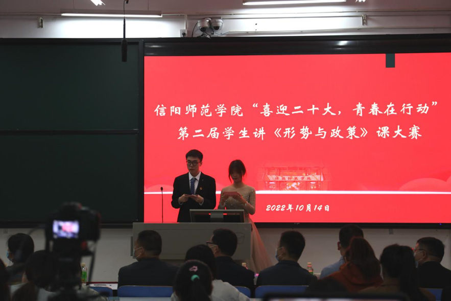 10月14日,由教师教育学院思想政治教育与就业指导教研室教师教育学院团委教师教育学院融媒体工作室主办,法学与社会学学院团委、教育科学学院团委、美术与设计学院团委、建筑与土木工程学院团委、谭山书院团委、教师教育学院团委联合举办的信阳师范学院“喜迎二十大,青春在行动”学生讲《形势与政策》课大赛,在社科楼121迎来了激动人心的决赛。
