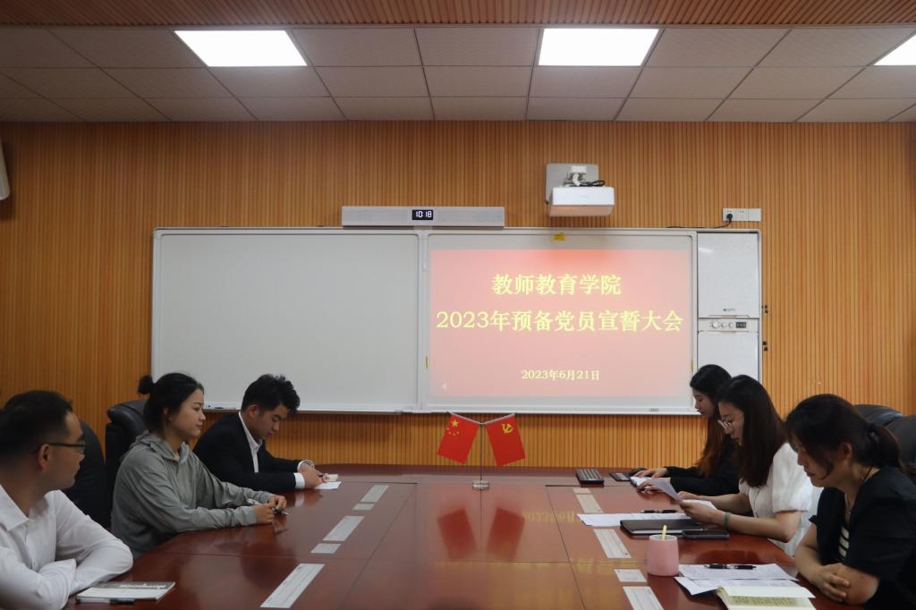 6月21日上午,教师教育学院在教七楼301会议室举行了2023年预备党员宣誓大会。学院党委副书记王艳蕊、专职组织员李依、16名正式党员以及25名预备党员到场参会。会议由李依主持。