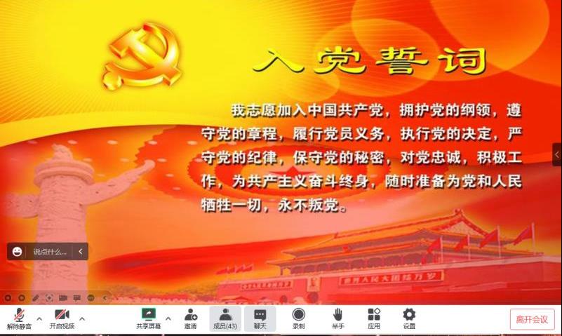 会议议程的最后一项,与会的正式党员、新发展的正式党员与新发展预备党员在姚雨承带领下共同宣誓。