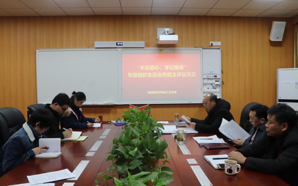 根据学校党委印发《关于第二批主题教育单位基层党组织召开专题组织生活会和开展民主评议党员的通知》(教组发[2019]37号)文件要求,12月3日上午、下午,教师教育学院教工党支部、学生党支部分别在教七楼301会议室开展“不忘初心、牢记使命”专题组织生活会暨民主评议党员大会,学院党委副书记潘登、副院长付永昌分别参加两个支部的会议并作指导。