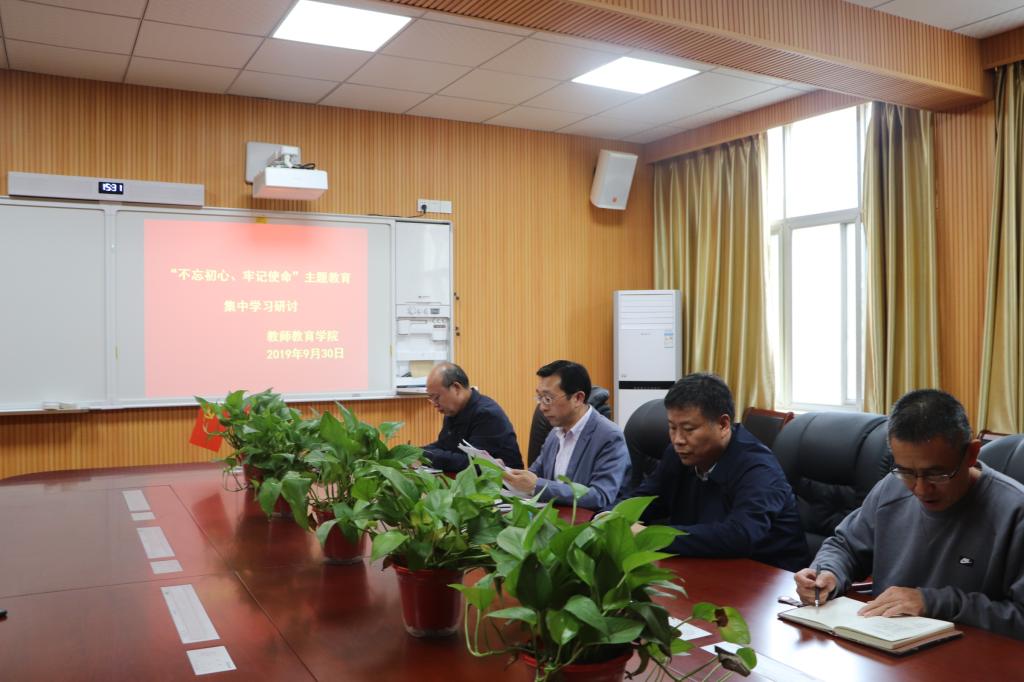 根据省委“不忘初心、牢记使命”主题教育巡回指导组要求和学校主题教育工作安排,9月29日至30日,教师教育学院党委在教七楼303会议室开展了为期两天的“不忘初心、牢记使命”主题教育集中学习研讨。学院党委副书记潘登、副院长付永昌及党委委员李文田参加学习研讨会。会议由潘登主持。