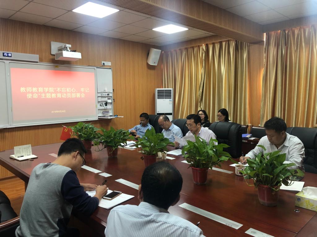 为认真贯彻习近平总书记在“不忘初心、牢记使命”主题教育工作会议上的重要讲话精神,认真落实《关于印发<中共信阳师范学院委员会关于开展“不忘初心、牢记使命”主题教育的实施方案>的通知》文件精神,9月24日,我院“不忘初心、牢记使命”主题教育动员部署会在教七楼301会议室举行。我院党委副书记潘登、副院长付永昌等全体党员参加此次会议,会议由潘登主持。