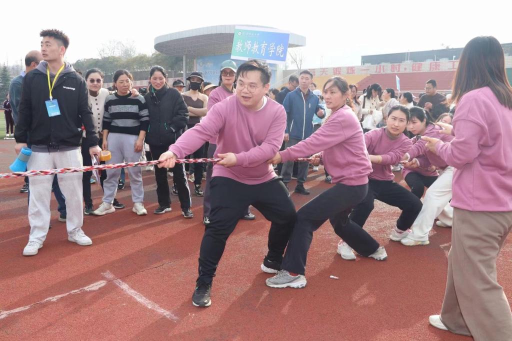 运动会上,校党委书记王文鹏致开幕词,向全体女教职工致以节日的问候和美好的祝愿。校党委副书记、工会主席岳宗德宣布本次趣味运动会开幕。在比赛正式开始前,参加比赛的教师在场地内跳起健身操,积极热身,为本次比赛做好充分准备。本次运动会设有拔河、袋鼠接力、旱地龙舟、旋风跑等团体项目,趣味性和协作性为一体,现场气氛既妙趣横生又紧张激烈。各支队伍积极参赛,充分发挥了团结协作、奋力拼搏的精神,尽显巾帼风采。在拔河比赛中,我院教师热情高涨,个个精神抖擞,随着裁判员一声令下,教师们个个双手紧握长绳,憋足气、鼓足劲,所有人的心凝聚在一条绳索上。赛场上欢呼声、喝彩声不绝于耳,洋溢着欢乐的气氛。我院教师队伍在本次趣味运动会上表现优异,在旱地龙舟、旋风跑两个项目中均进入八强,学院荣获优秀组织奖。