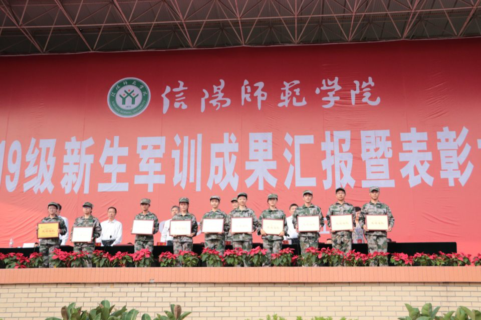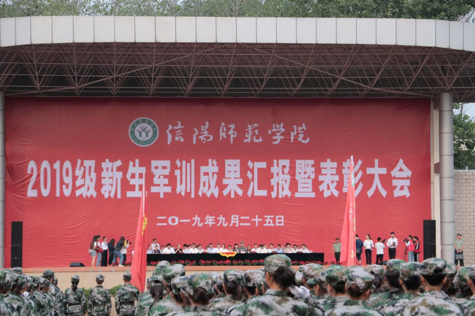 军歌嘹亮声震天威,军拳汇演气壮山河。9月25日上午,信阳师范学院2019级新生军训成果汇报暨表彰大会在西操场隆重举行。我校党委书记宋争辉,校长李俊,武装部部长杨建华,校党委副书记郜火星,校纪委书记龚立新,副校长陈登报、余本海、王金云、胡海华、王文臣出席大会。有关职能部门、各学院负责人与2019级全体新生参加大会。