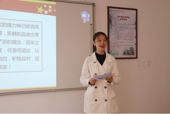 比赛中,参赛者紧扣“我与祖国共成长”主题,结合国内外时事热点,运用PPT演示、案例分析、播放音频及视频等丰富多样的多媒体形式展现课程内容,具体细致地分析了自己对所讲课题的深刻认识。短短的七分钟,参赛者们以生动形象的表达、设计新颖的内容以及从容自信的姿态,给在座的评委老师留下了深刻印象,同时,也使在场的同学有所思、有所悟,引发了思想上的共鸣。其中,美术与设计学院袁飘然围绕“以抗疫精神,凝聚中国力量”,讲述了在疫情期间奋斗在抗疫一线的医护人员的先进事迹,弘扬他们无私奉献的精神,勉励同学们在困难面前要树立起与国家共患难、与祖国共成长、与人民共进步的家国精神。教师教育学院赵婕如以脱贫攻坚作为内容,从原因、困难及成就三个方面着手,向同学们讲理论、抒真情、颂先进,用以小见大的方法,号召广大青年学生积极参与到脱贫攻坚工作中来,用自己的知识特长为脱贫攻坚出谋划策。在一番激烈的竞争较量后,经过评委公正客观的综合评分,27支队伍从100多个团队中脱颖而出,成功进入预决赛阶段。