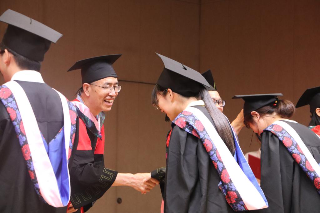 学院十名教师上台进行拨穗和学位授予仪式。拨穗,代表麦穗已经成熟,象征毕业生已学有所成,可以展翅高飞。身着学士服的189名毕业生有序上台接受拨穗和学位授予。麦穗从右到左,毕业生从稚嫩到成熟,手捧学位证书的的毕业生们已经随着麦穗的拨动翻开了人生的新篇章。仪式在毕业生坚定高歌“没有共产党就没有新中国”一曲中圆满结束。