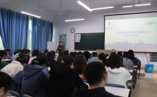 他结合信阳市电信诈骗犯罪的总体情况详细讲解了电信诈骗的起源、危害、主要特点、作案手法,并结合实际案例对常见的兼职刷单、冒充购物客服诈骗、网上贷款诈骗、冒充公检法诈骗、投资理财诈骗、冒充熟人诈骗等十余种常见的诈骗类型进行了详细分析。他强调,作为学生,在日常生活中,要做到不轻易点链接、不轻易扫码、不轻易汇款,要加强法律法规学习,提高法治意识,在上网过程中,学会分辨违法信息,守住本心,避免成为他人实施违法犯罪的工具。不要将自己微信、QQ号、身份信息、银行卡等出租或转借他人使用,防止被违法犯罪分子利用。最后,他要求学生下载“国家反诈中心”APP,用六个“凡是”警醒学生防范网络诈骗。