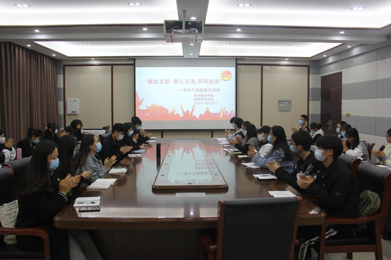 10月23日晚,教师教育学院联合教育科学学院于教科楼402会议室召开学生干部经验交流会。双方负责人孙艳慧、陈钊,学生干部代表共同参加此次交流会。会议由教科院执行主席孙艳慧主持。