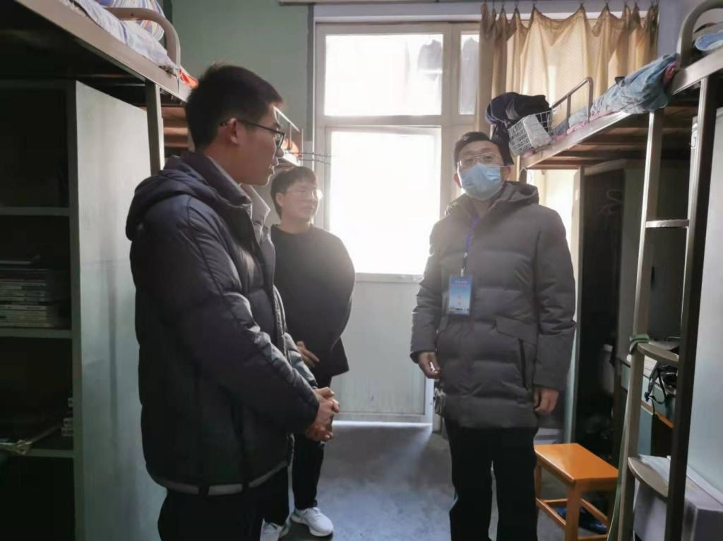 潘登首先查看了宿舍的各项设施,了解学生假期状态及新学期计划,对学生关心的问题耐心解答;叮嘱学生养成良好的生活习惯,尽快调整作息习惯;指导学生做好新学期学习、成长规划,以积极昂扬的状态投入到新学期的学习与生活中。付永昌亲切地和同学们交流,他叮嘱同学们新学期仍要严格按照疫情防控要求做好宿舍内务整理、通风消毒、一日三检等日常工作,同时鼓励学生在新学期能够不忘初心、坚持理想、努力学习、夯实基础,在不断挑战自我中成长。同学们备受鼓舞,对领导老师们的关切表示感谢,纷纷表示在新的一年继续奋斗,学好专业知识,不断提升自己。
