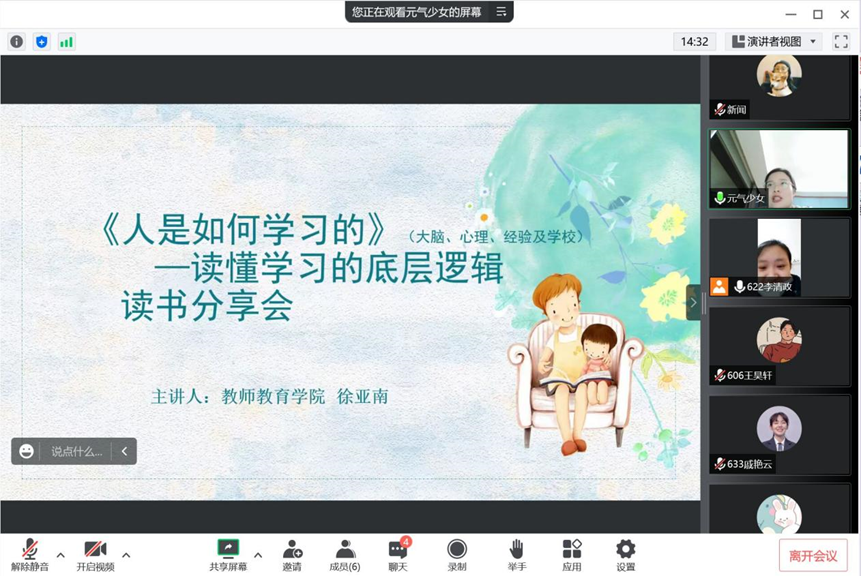 12月2日晚,教师教育学院第九期从游读书会在线上举行。本期领读人徐亚南以“读懂学习的底层逻辑”为主题,与在场师生分享了《人是如何学习的》(大脑、心理、经验和学校)一书,活动由李清政主持。