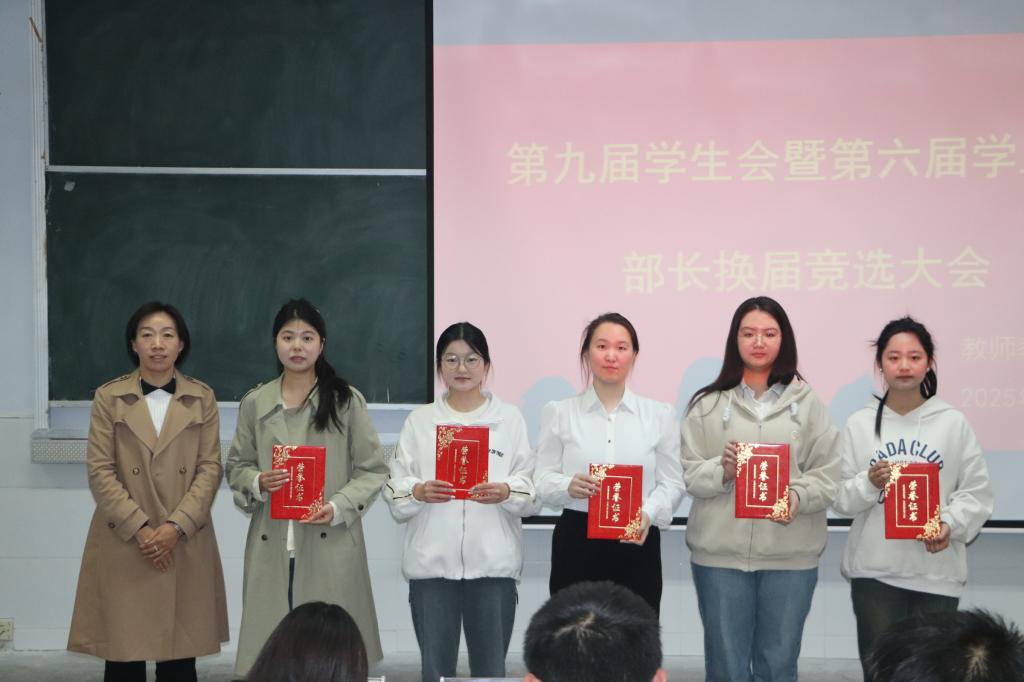 大会伊始,主持人简要介绍大会流程与目的,为活动拉开序幕。随后,竞选人依次上台发言,他们分享这一年的工作经验、对未来工作的规划与展望,展现出对学生工作的热忱以及积极进取的精神风貌。接着,张小丫与融媒体部长贺馨茹分别进行工作总结,张小丫回顾了过去一年活动组织、工作协调等方面的经历与成果,指出优点与不足;贺馨茹则聚焦新闻报道工作,展示学院在新媒体平台的建设成果,如公众号运营数据、校园活动报道影响力等,为后续宣传工作提供参考。随后,王淑贤进行总结发言,她对换届大会的顺利进行表示祝贺,对卸任学生干部的辛勤付出表示感谢,同时对新成员提出期望,希望新成员在新岗位上勇于担当、积极创新,为学院的学生工作注入蓬勃活力,引领同学们共同迈向更辉煌的未来。最后,学院对过去一年表现优异的学生会干部和积极参与学院活动的同学进行表彰,与会的领导老师上台与获奖同学一起合影留念,肯定他们为学院发展付出的努力与贡献,激励全体同学以他们为榜样,积极投身学院建设。