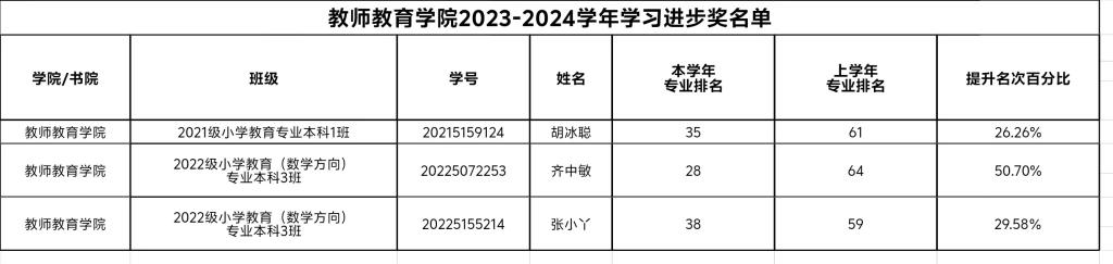 为做好2023-2024学年“学习进步奖”评选工作,教师教育学院严格依照《信阳师范大学“学习进步奖”奖学金评定办法》(校办字〔2023〕3号),按程序开展评审工作。秉持公平、公正、公开的原则,按程序开展评审工作。经过认真对比评选,现将信阳师范大学教师教育学院2023——2024学年“学习进步奖”拟推荐名单予以公示。“学习进步奖”拟推荐具体名单见下表。